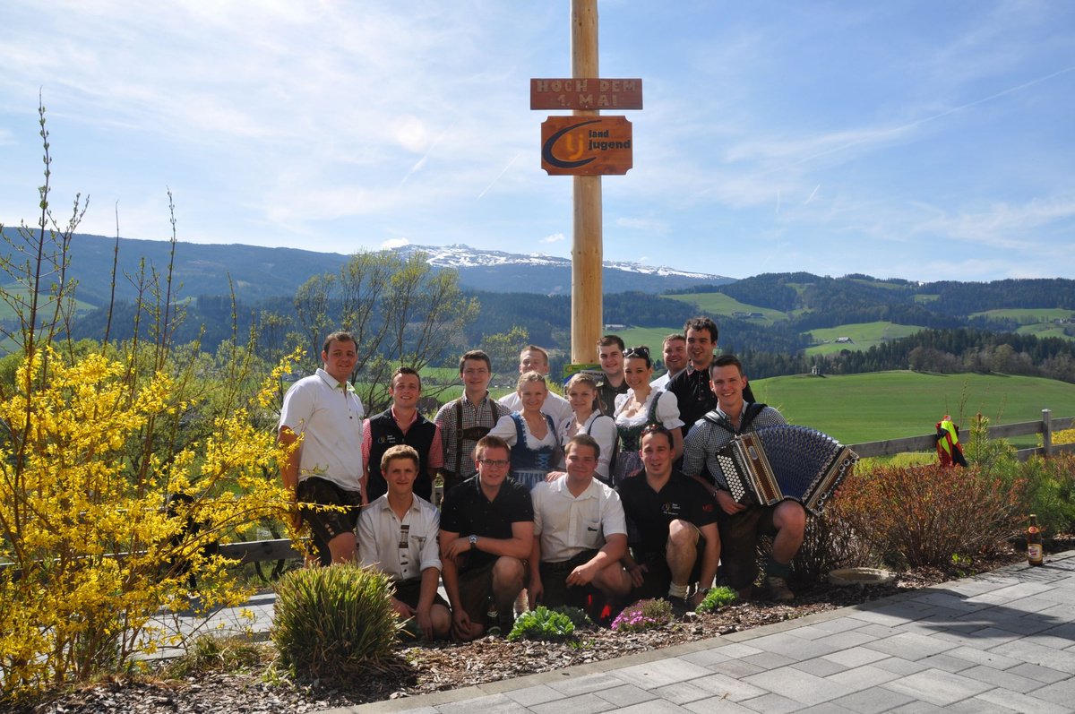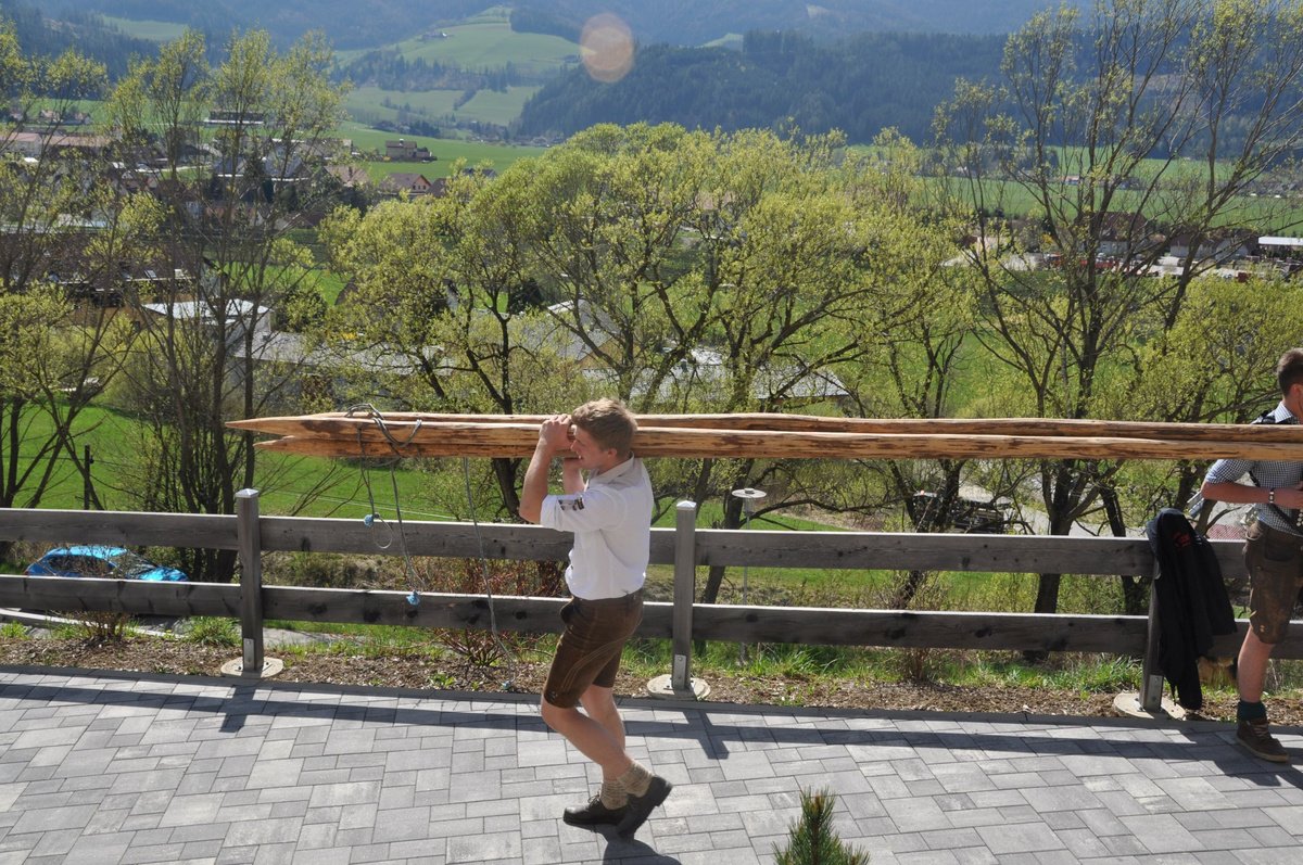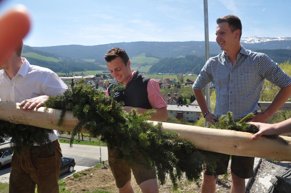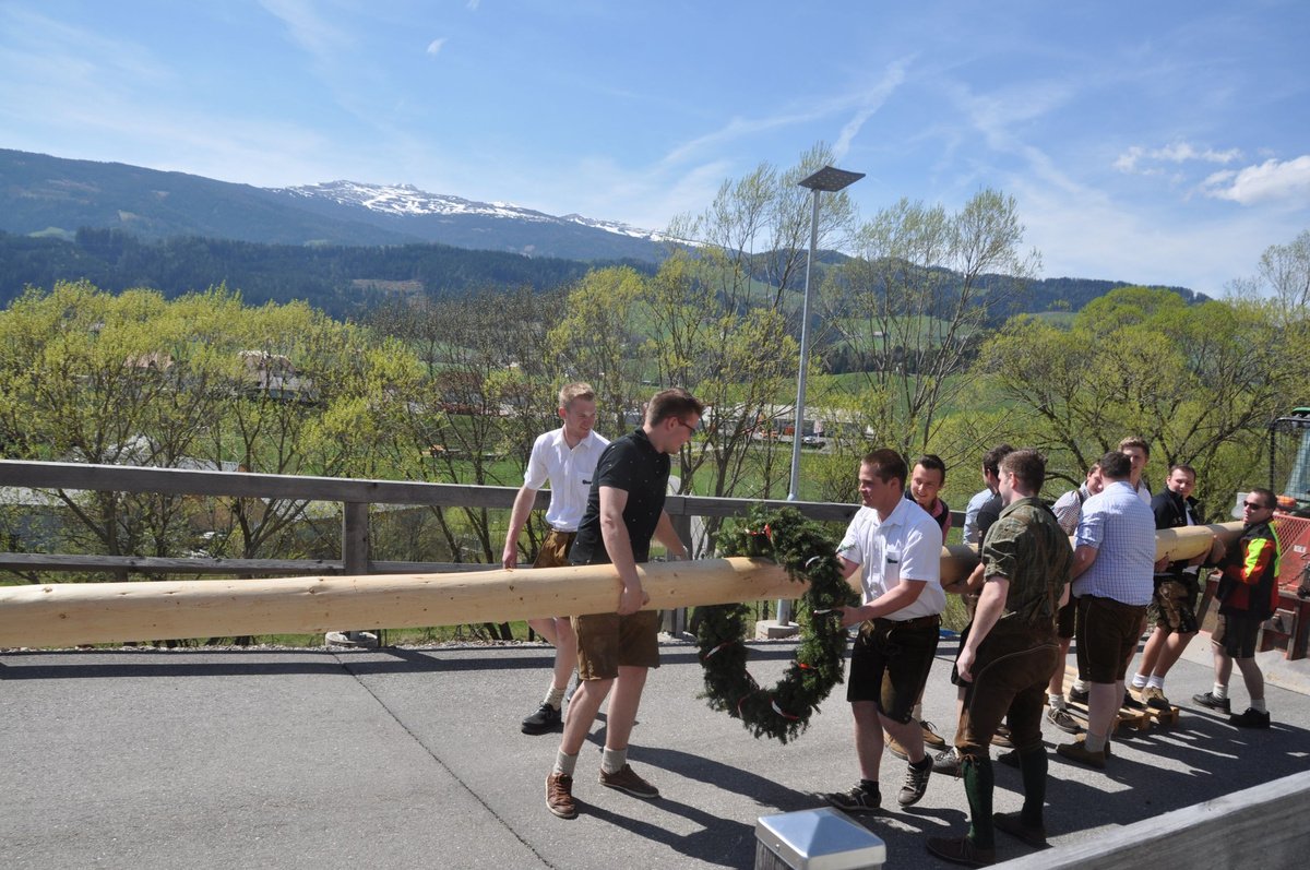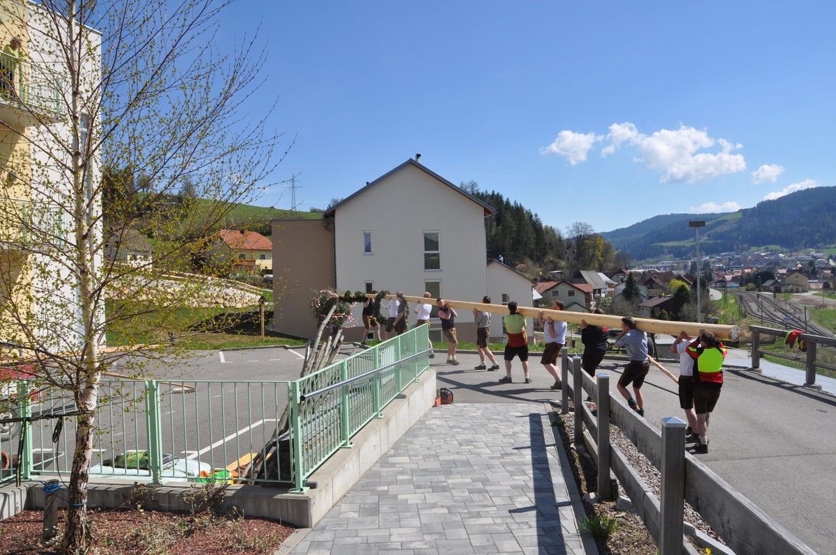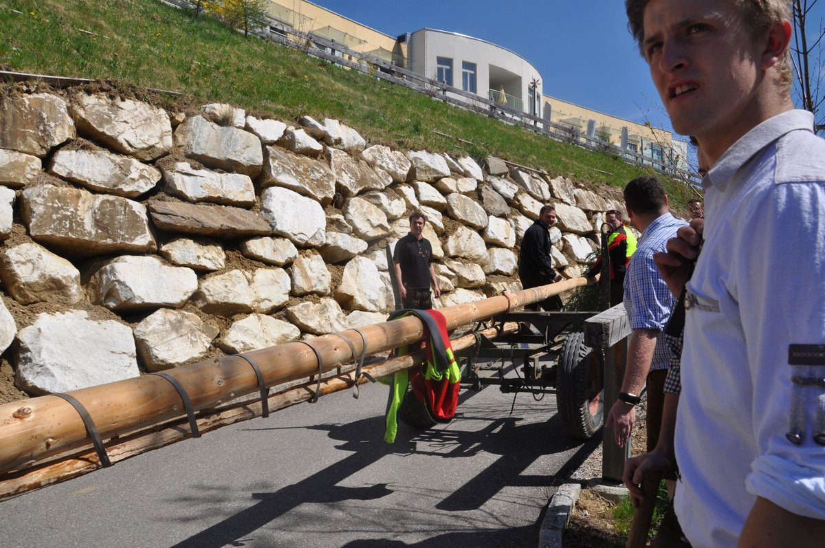 Nachdem die Jungs gemeinsam mit dem Baum heil um 14.00 Uhr in der Seniorenresidenz eintrafen, nahmen wir noch den allerletzten Feinschliff vor. Nun waren starke Hände gefragt, 12 Burschen stellten den Maibaum tadellos auf und wurden dabei von den drei Mädels angefeuert. Später begrüßte unser Obmann Michael Leitner die Heimbewohner und Leiterin Angelika Richter trug ein kurzes Maibaumgedicht vor. Auch unseren Bürgermeister Peter Bacher durften wir willkommen heißen. Umrahmt von den Klängen der Harmonika, genossen wir noch den wunderschönen, sonnendurchfluteten Nachmittag in lustiger Gesellschaft. Auch eine leckere Jause wurde uns zur Stärkung serviert, die hatten wir uns richtig verdient! :-) Nach diesem Tag freuen wir uns alle schon wieder, den Baum in die Quere zu bringen. Den im Sommer heißt es dann wieder: „BAUM FÄLLT!“ :-) by Susi Schlacher :-)