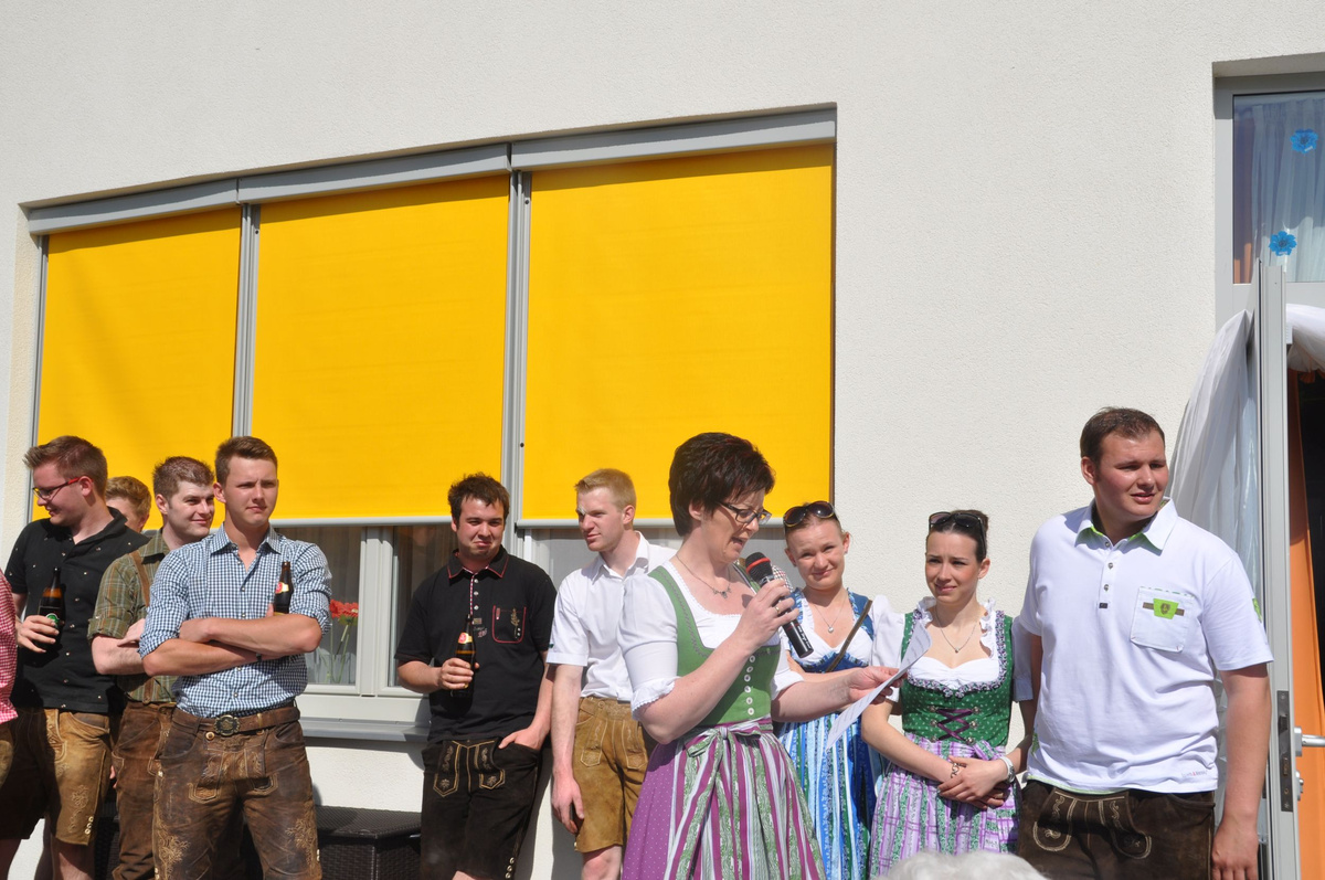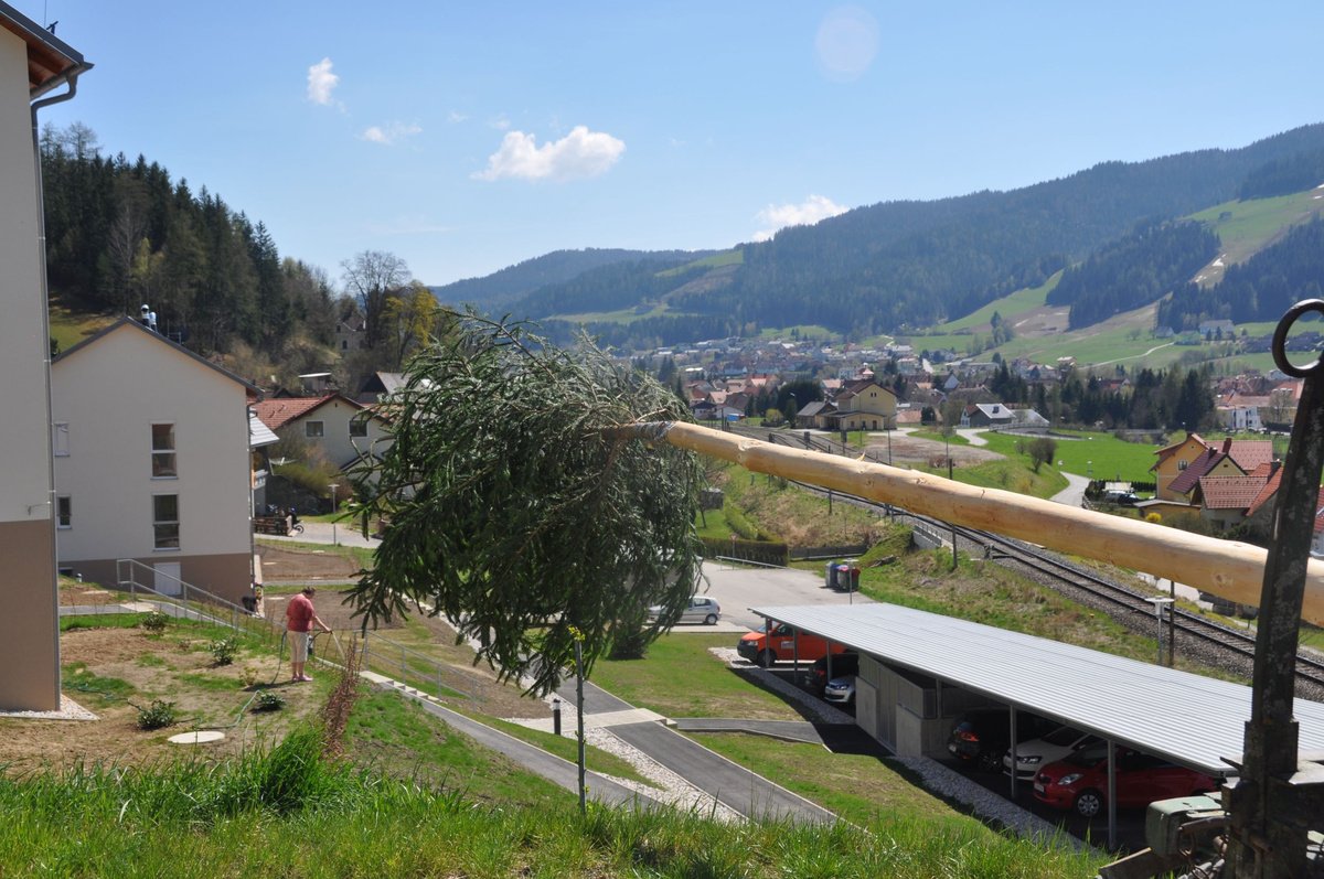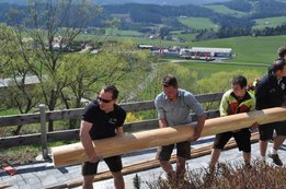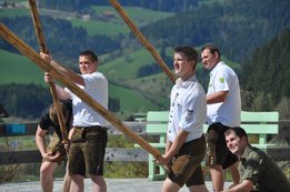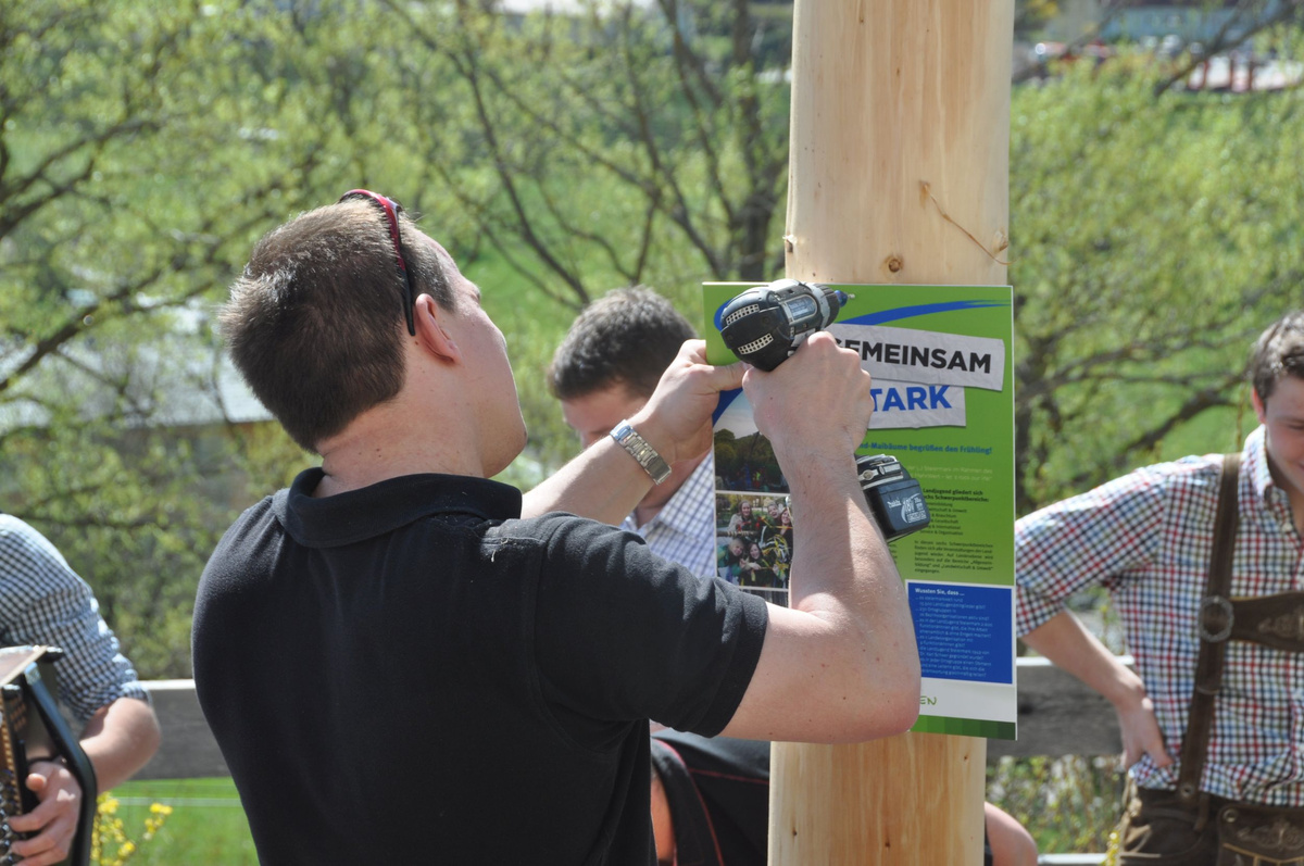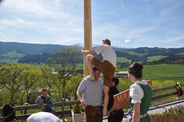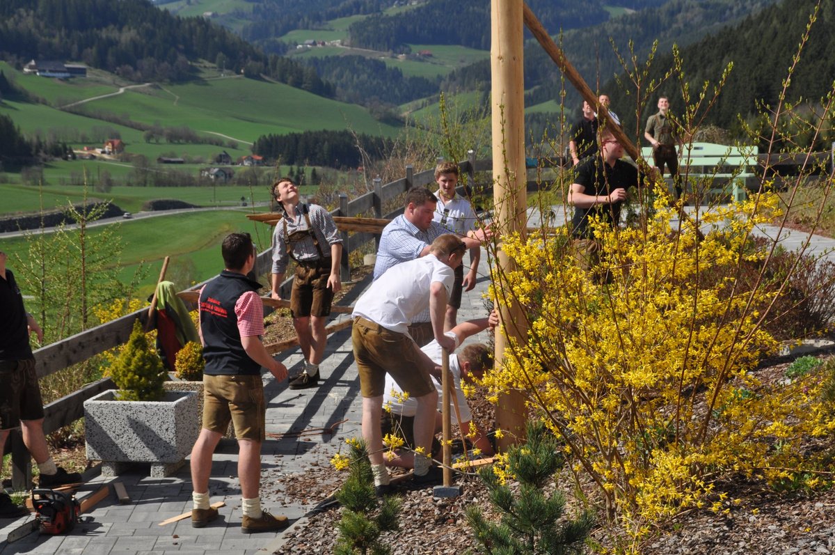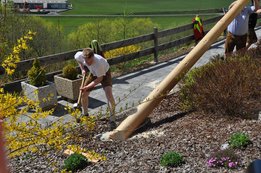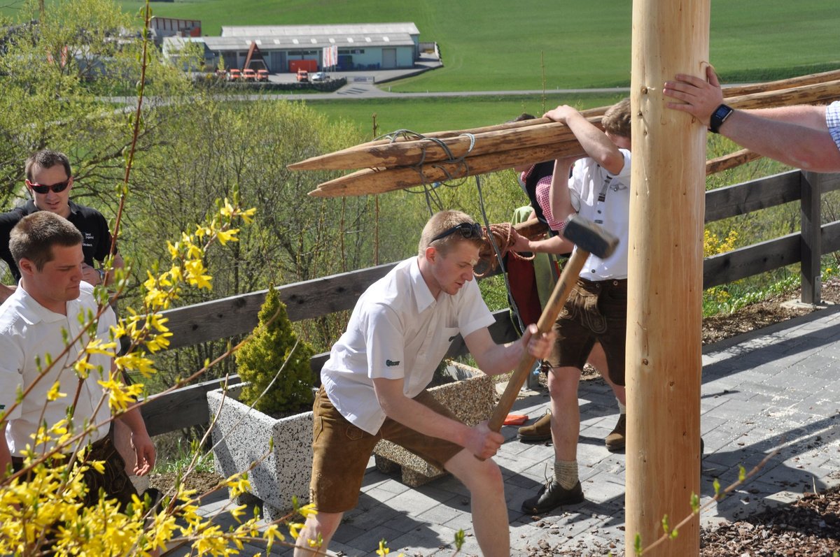 Nachdem die Jungs gemeinsam mit dem Baum heil um 14.00 Uhr in der Seniorenresidenz eintrafen, nahmen wir noch den allerletzten Feinschliff vor. Nun waren starke Hände gefragt, 12 Burschen stellten den Maibaum tadellos auf und wurden dabei von den drei Mädels angefeuert. Später begrüßte unser Obmann Michael Leitner die Heimbewohner und Leiterin Angelika Richter trug ein kurzes Maibaumgedicht vor. Auch unseren Bürgermeister Peter Bacher durften wir willkommen heißen. Umrahmt von den Klängen der Harmonika, genossen wir noch den wunderschönen, sonnendurchfluteten Nachmittag in lustiger Gesellschaft. Auch eine leckere Jause wurde uns zur Stärkung serviert, die hatten wir uns richtig verdient! :-) Nach diesem Tag freuen wir uns alle schon wieder, den Baum in die Quere zu bringen. Den im Sommer heißt es dann wieder: „BAUM FÄLLT!“ :-) by Susi Schlacher :-)