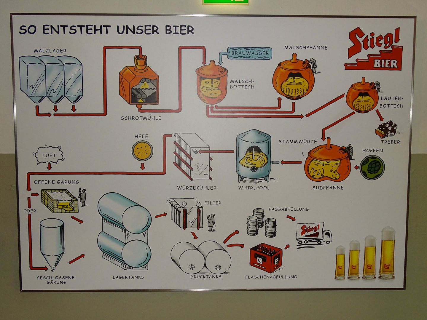 Bei einer Besichtigung durch die Welt des Stiegl Biers, durften wir interessante Informationen über die Herkunft sowie über die Herstellung des Stiegl-Bieres sammeln. Bei einer anschließenden Verkostung konnten wir dann aus drei Stiegl-Biersorten unseren persönlichen Favoriten küren. Auch versorgte uns die Brauerei mit einem köstlichen Mittagessen, bestehend aus Backhendl, Schweinsbraten, Ripperl und weiteren leckeren Schmankerln.